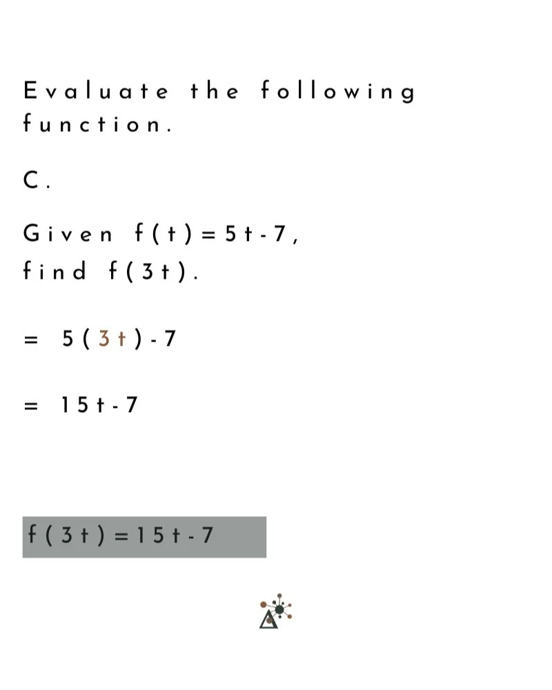 The text reads, “Evaluate the following function.” Underneath it reads “C. Given f(t)=5t-7, find f(3t).” Below, the problem is solved. “3t” replaces “t.” Problem now reads “=5(3t)-7”, then “15t-7”. Finally, in a shaded box, the answer says “f(3t)=15t-7”.
