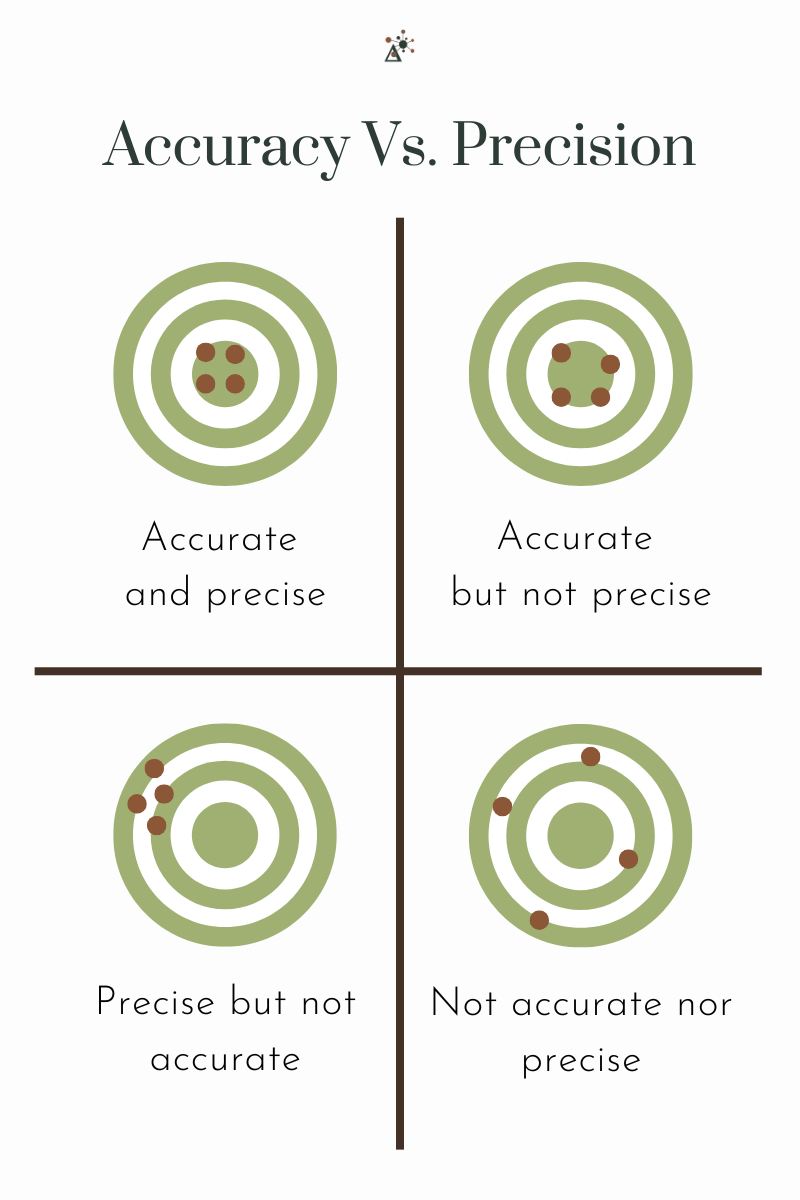 These concepts are critical in scientific research. For example, if you measure the same plant's height multiple times and your results are very close to each other, your data is precise. But if all your measurements are 3 cm too tall because you didn’t start measuring from the base of the plant, your results are not accurate.